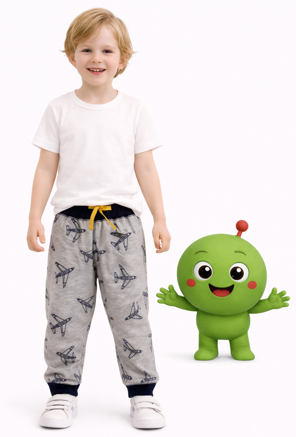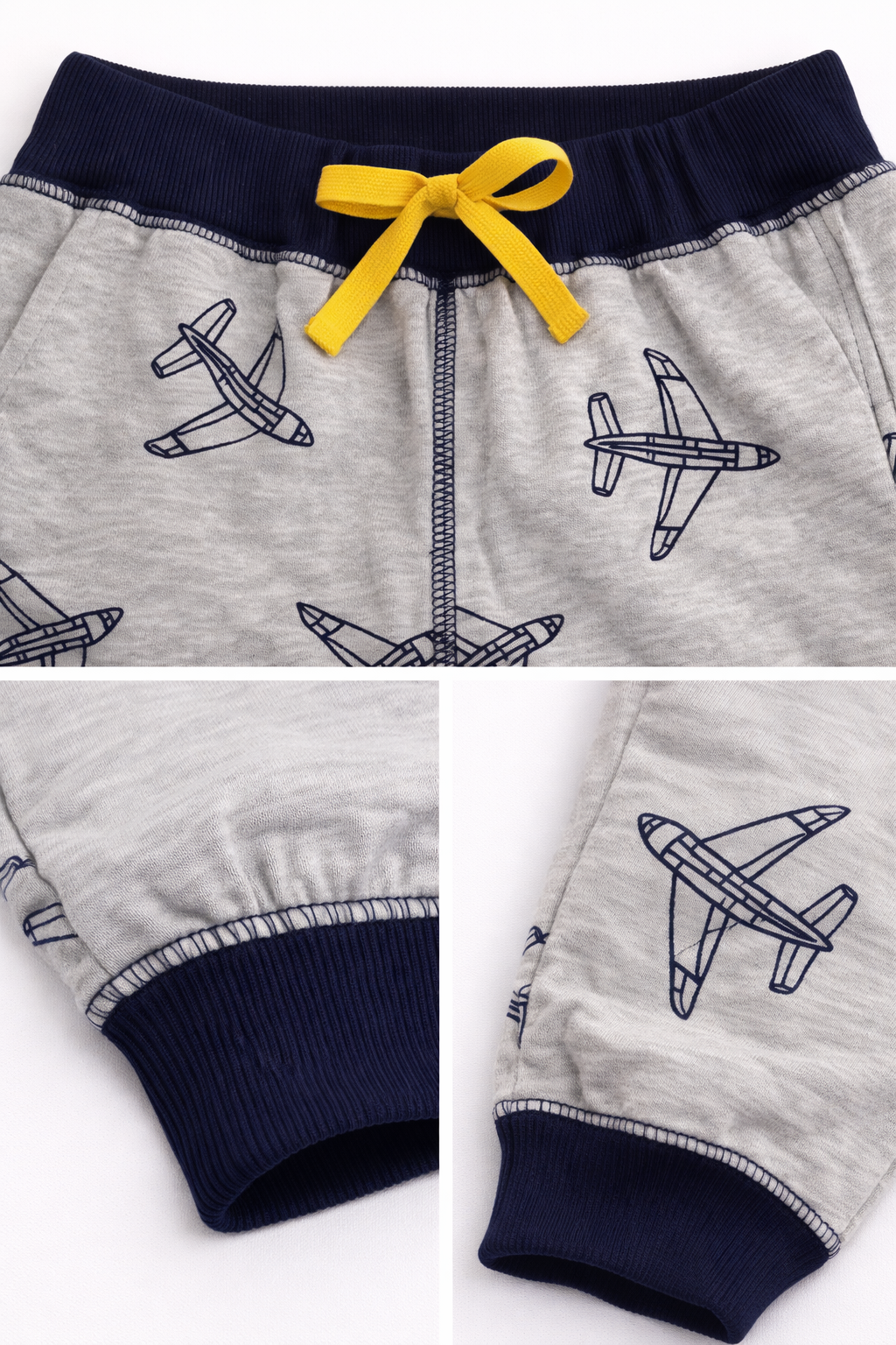 El diseño en color gris con estampado de aviones le aporta un estilo moderno y divertido, perfecto para niños activos. Su cintura elasticada con cordón ajustable permite un calce seguro y cómodo, adaptándose fácilmente al cuerpo del niño. Además, cuenta con puños elasticados en los tobillos, lo que mejora el ajuste y evita que el pantalón se suba durante el movimiento.