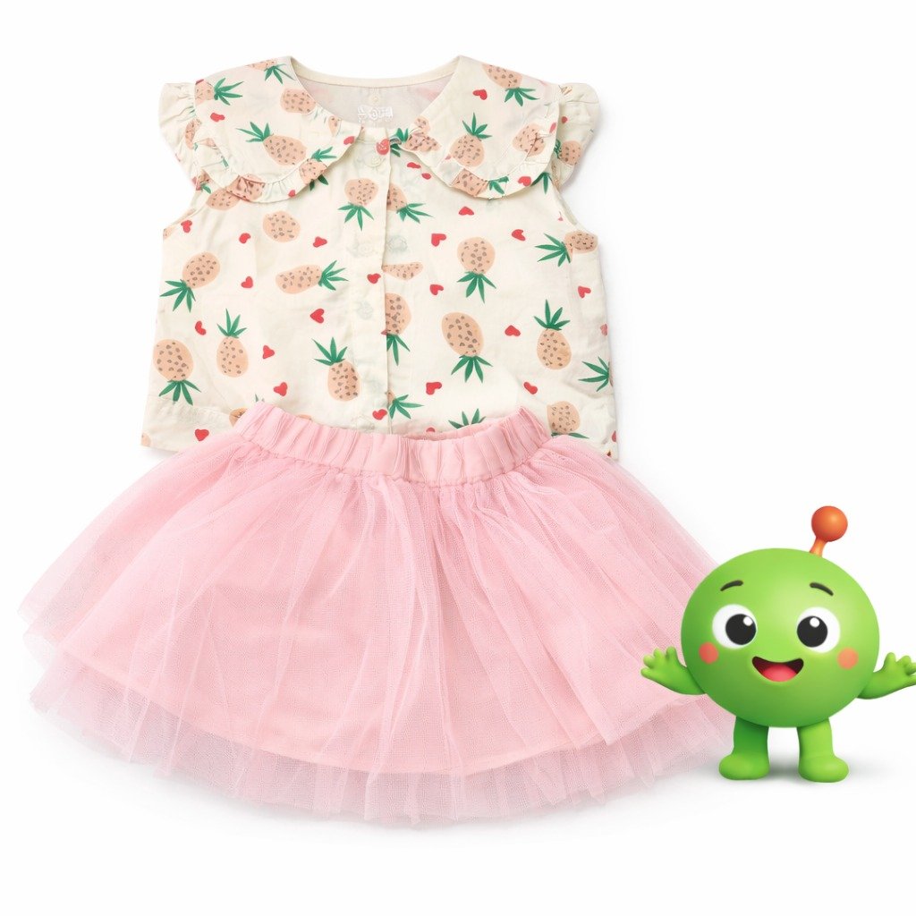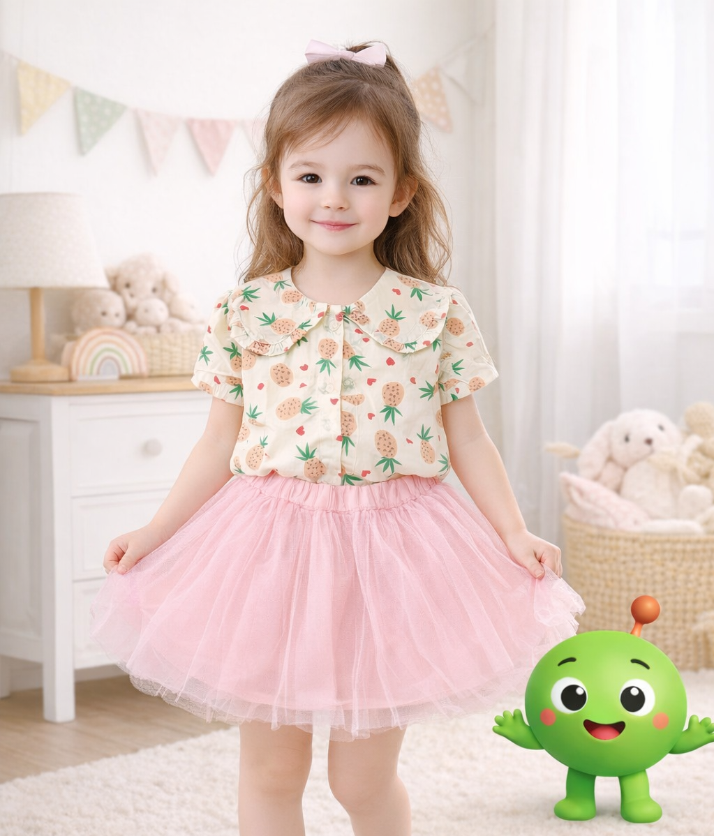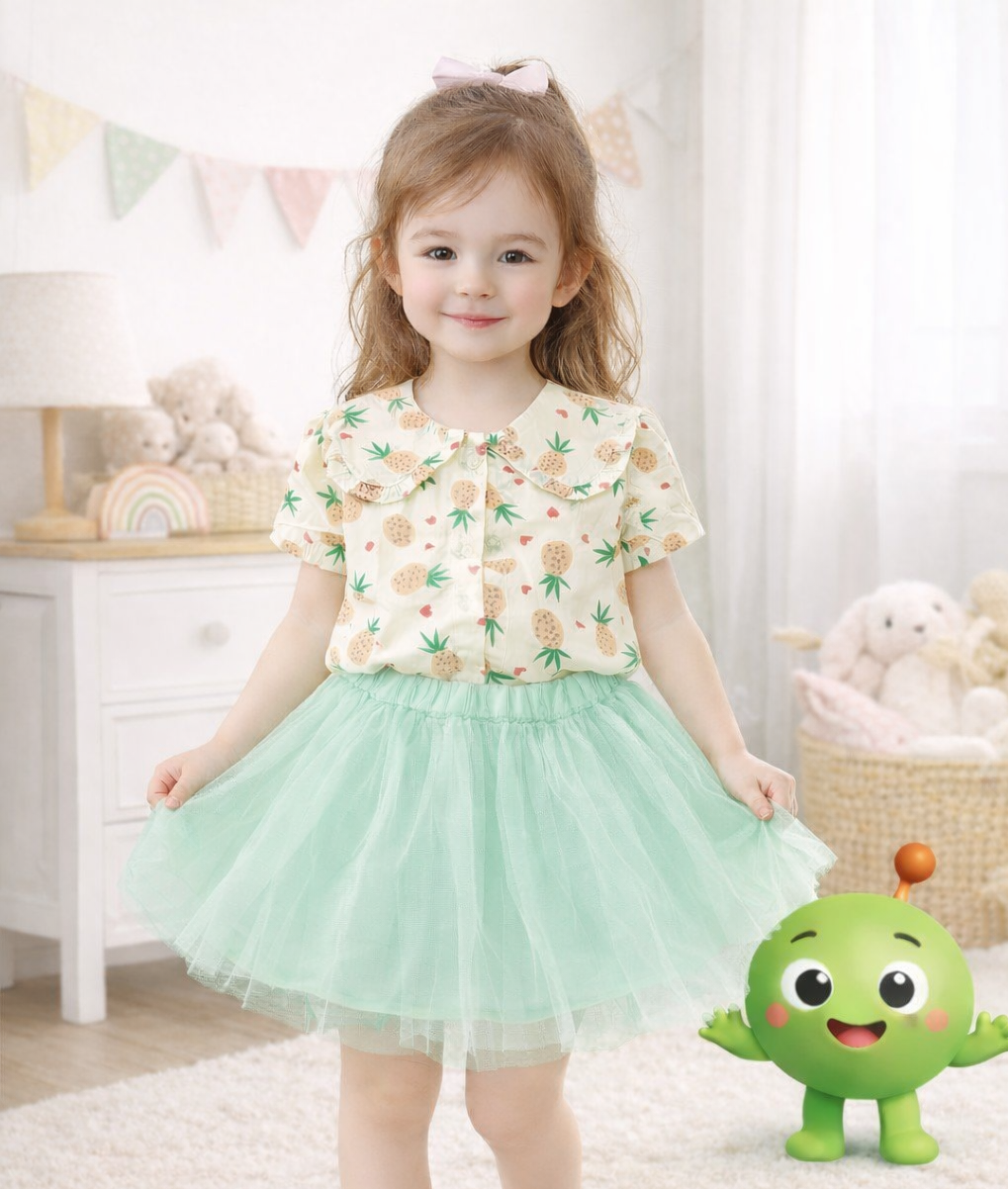 conjunto-polera-falda-algodon-ninas compuesto por blusa color crema con estampado de piñas y cuello con detalle de volante, acompañado de falda de tul con pretina elástica. Diseño cómodo, ligero y delicado, ideal para uso diario o ocasiones especiales.