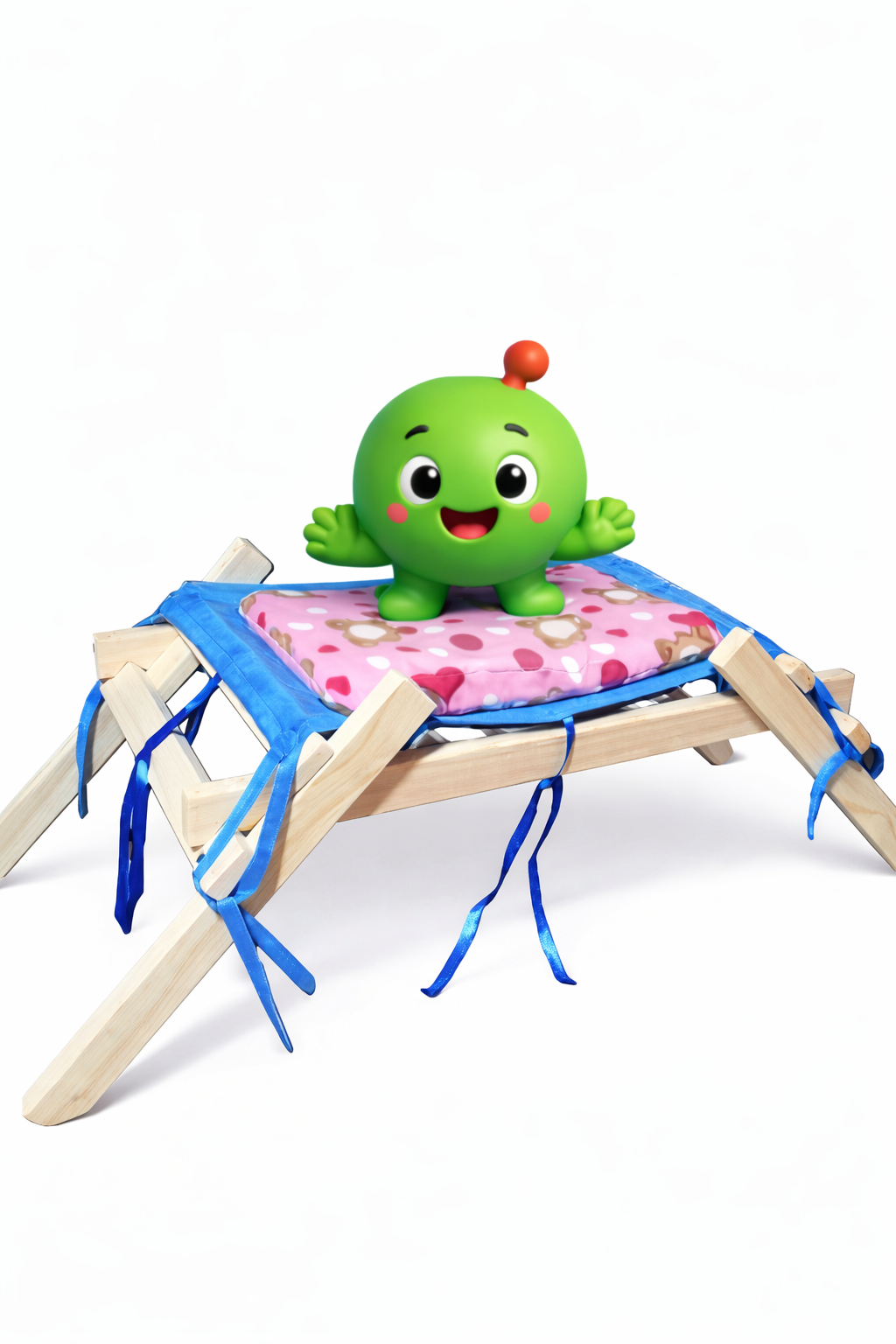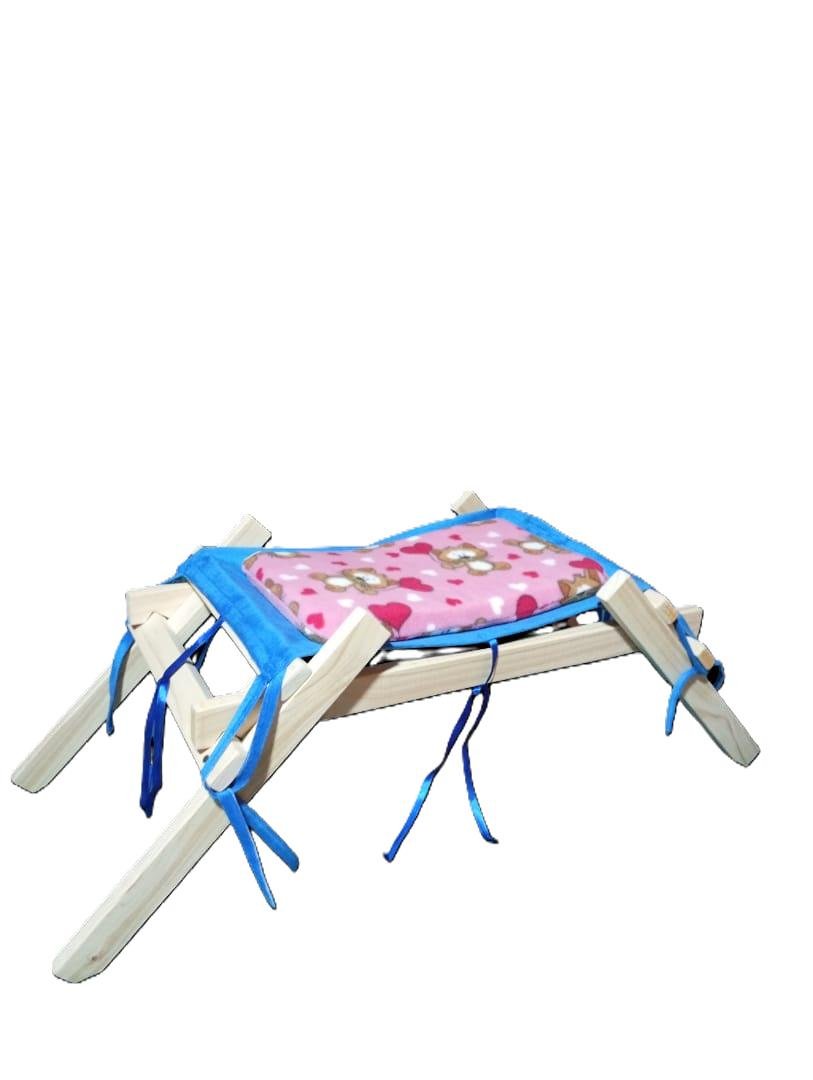Ofrece a tu gatito un espacio cómodo, elevado y acogedor con esta cuna tipo hamaca diseñada especialmente para su descanso. Fabricada con una estructura de madera firme y resistente, cuenta con una hamaca de felpa celeste y un colchon acolchado de polar suave en tonos rosados con diseño de corazones, ideal para mantener a tu mascota abrigada y relajada.